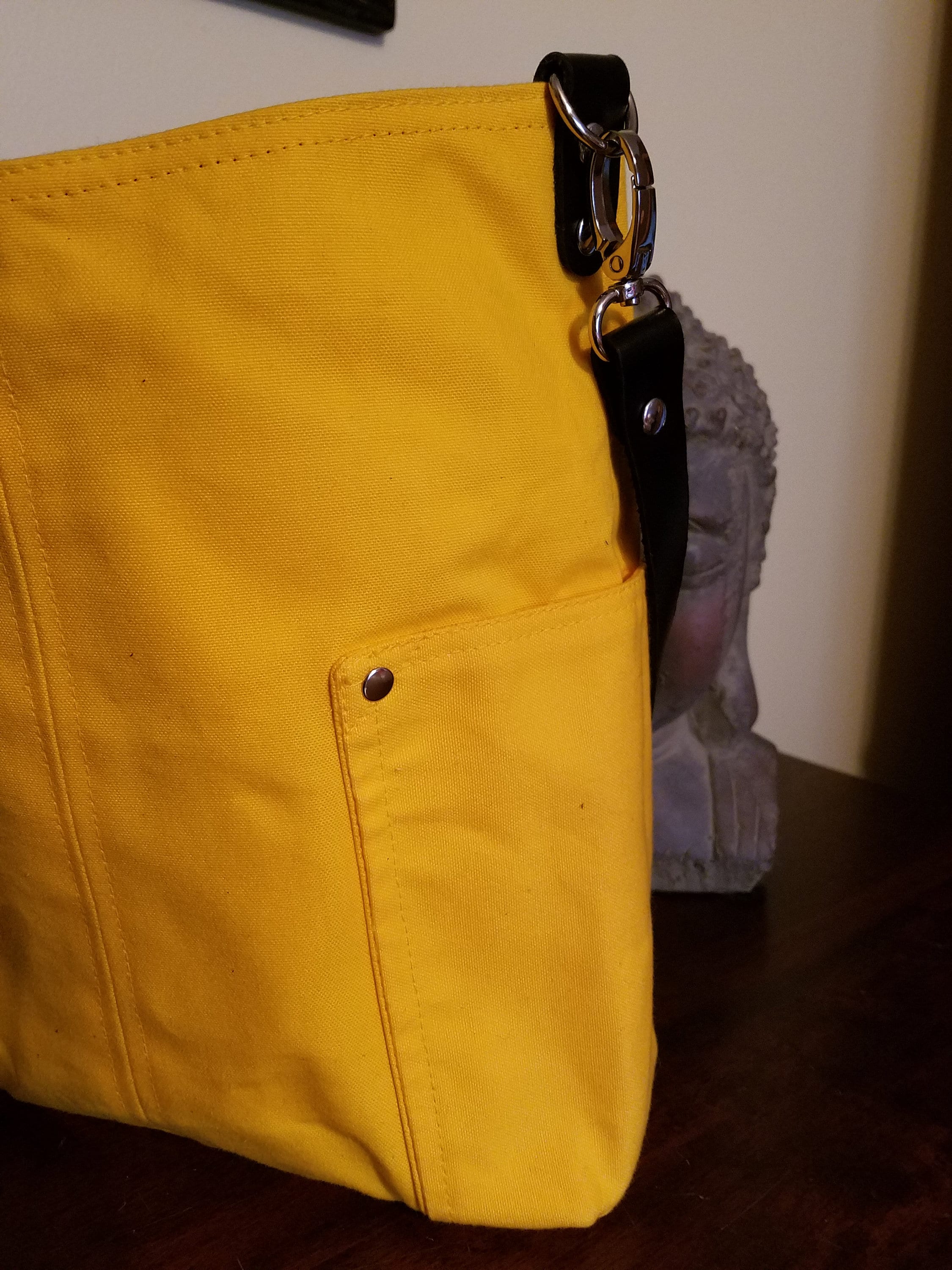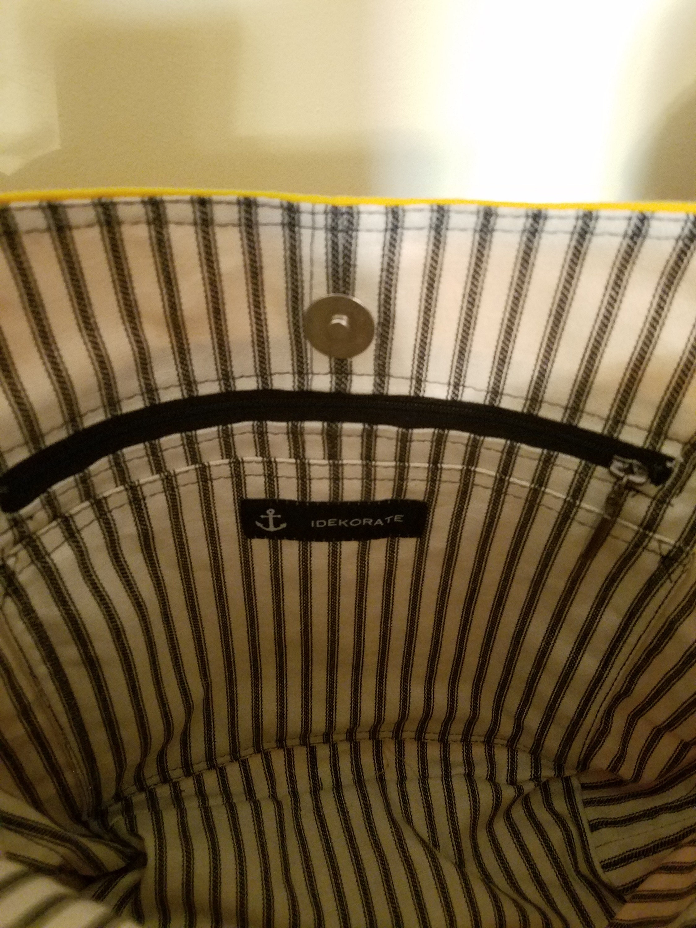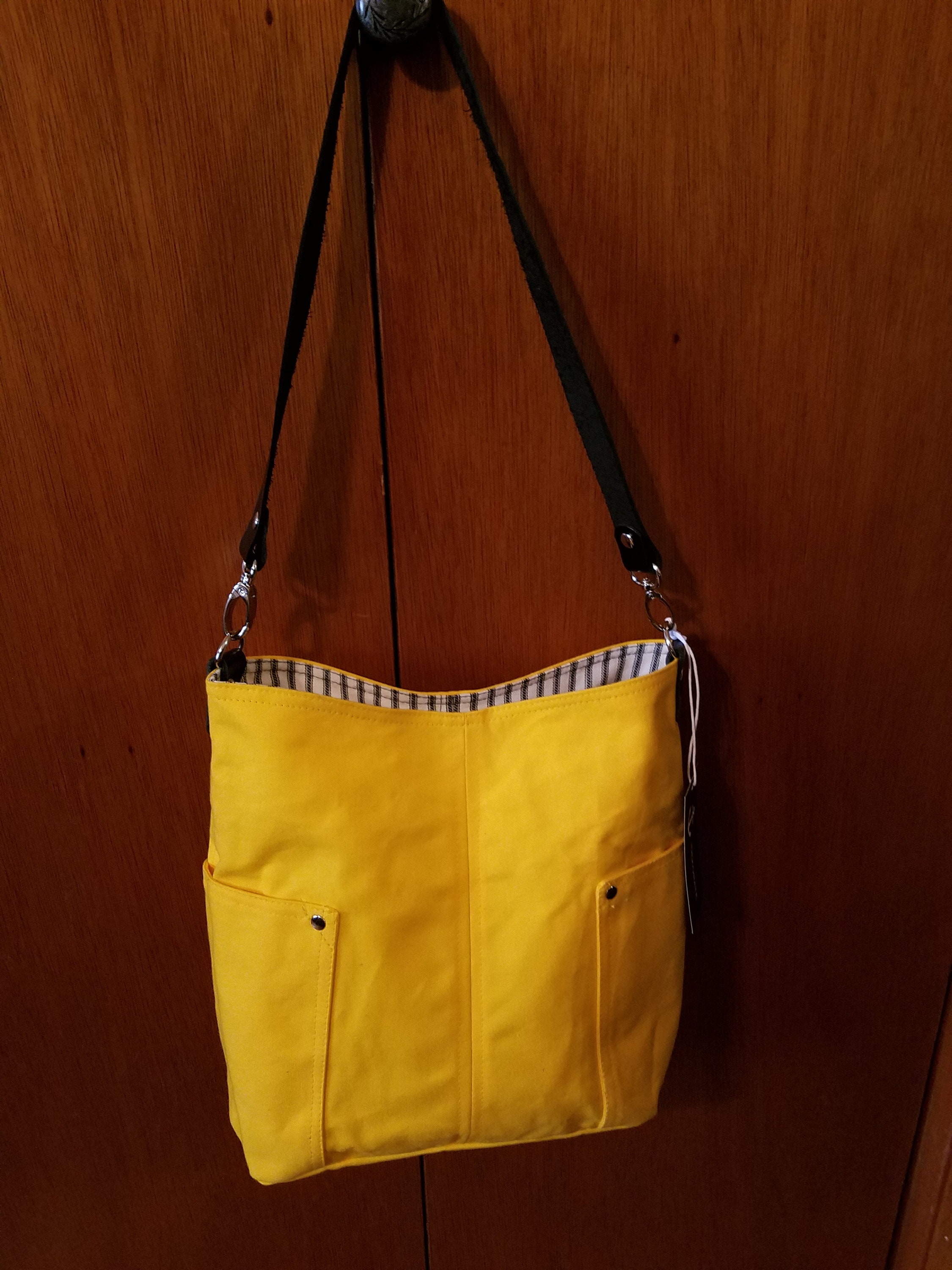 Made from Yellow canvas. Black leather strap. Lined with black and white ticking fabric.