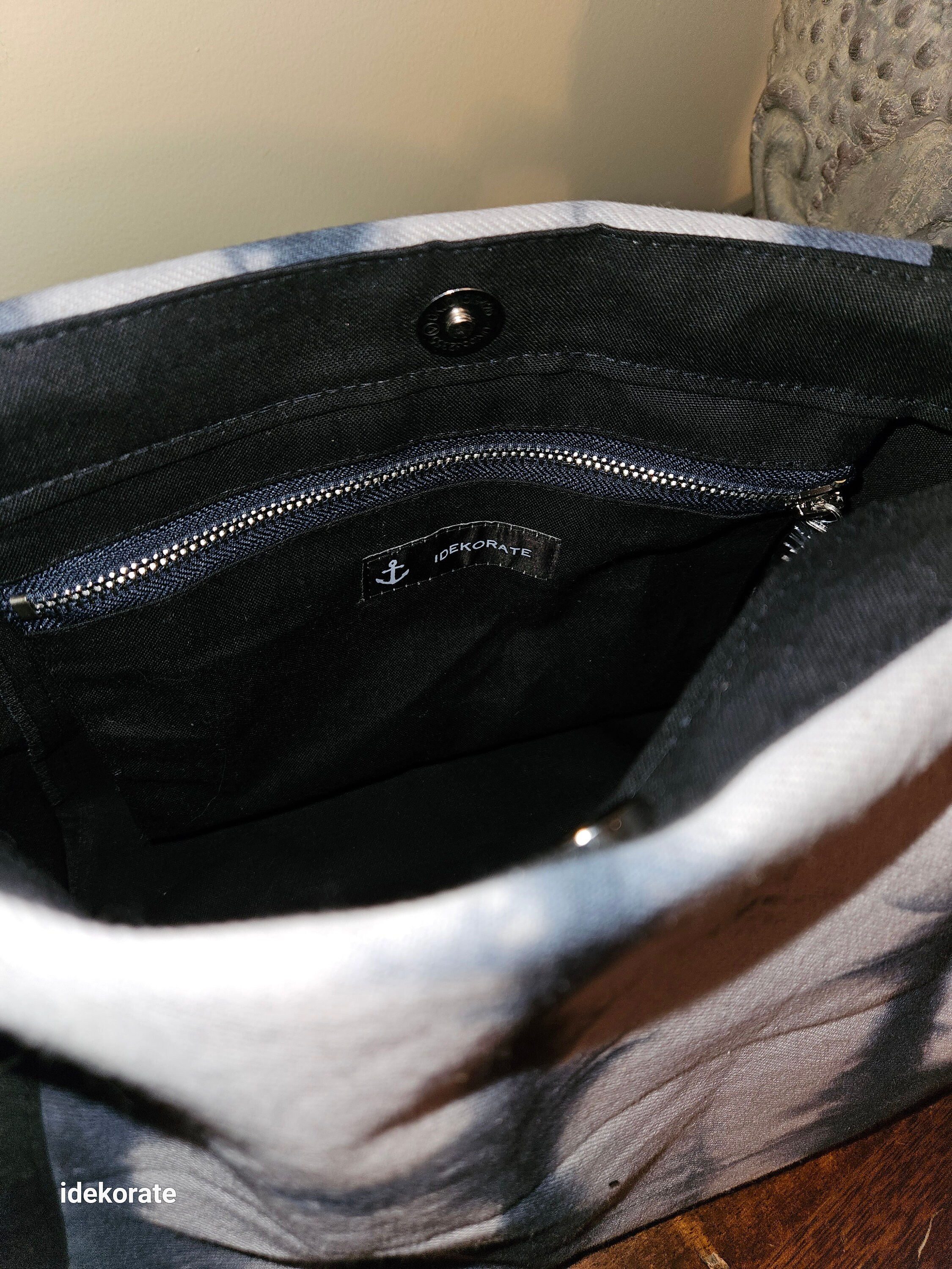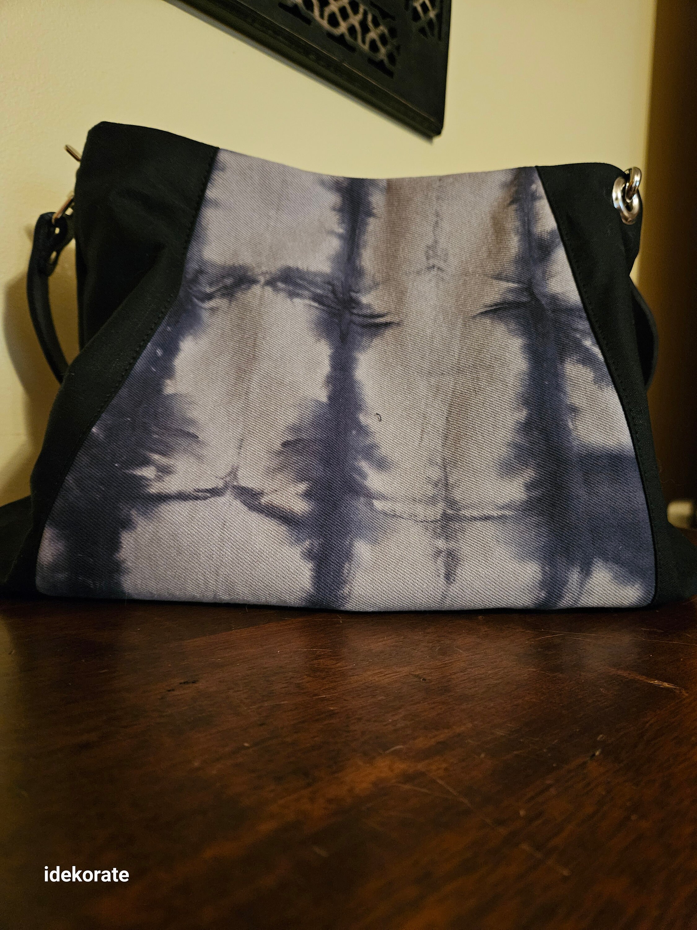 Shibori inspired Bag, handmade shoulder bag. Black, blue and grey