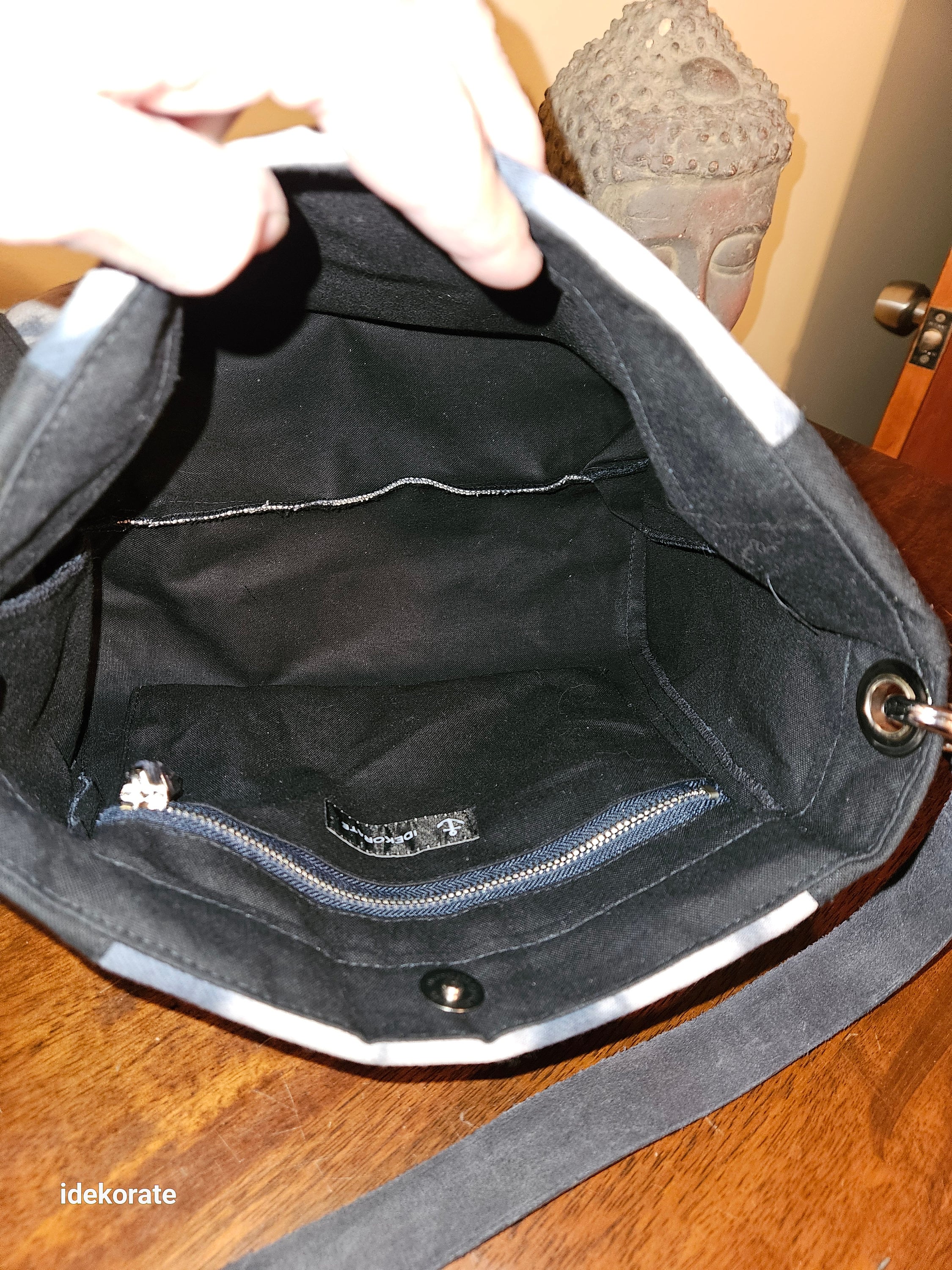 Made from heavy duty canvas, gray denim dyed design. Comes unlined with one zippered, interior pocket.