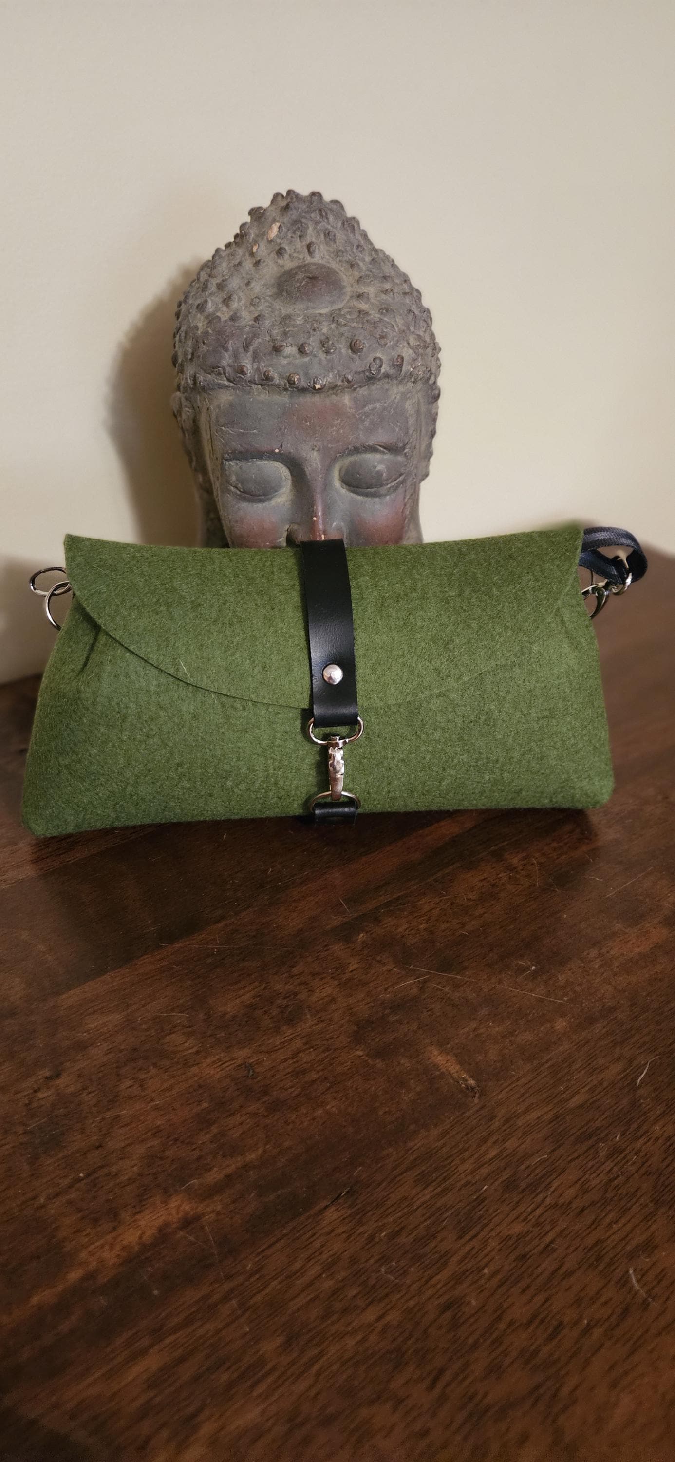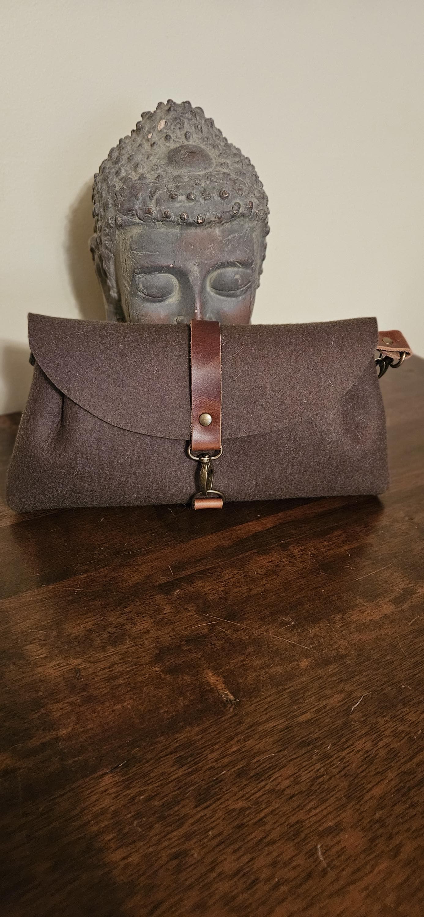 Genuine leather closure strap. The metal hardware is either silver tone or antique brass depending on felt color. Represented in the photos.