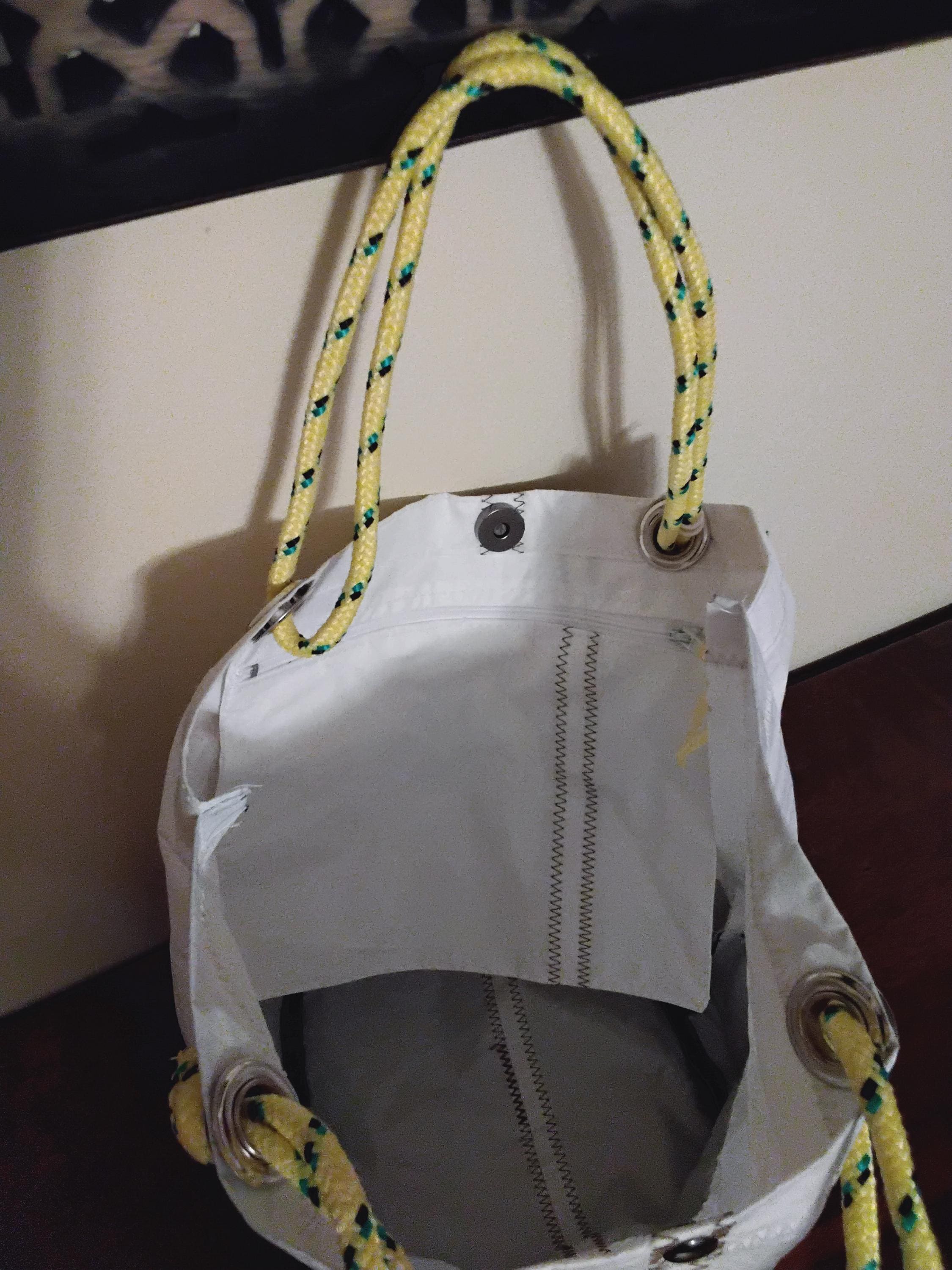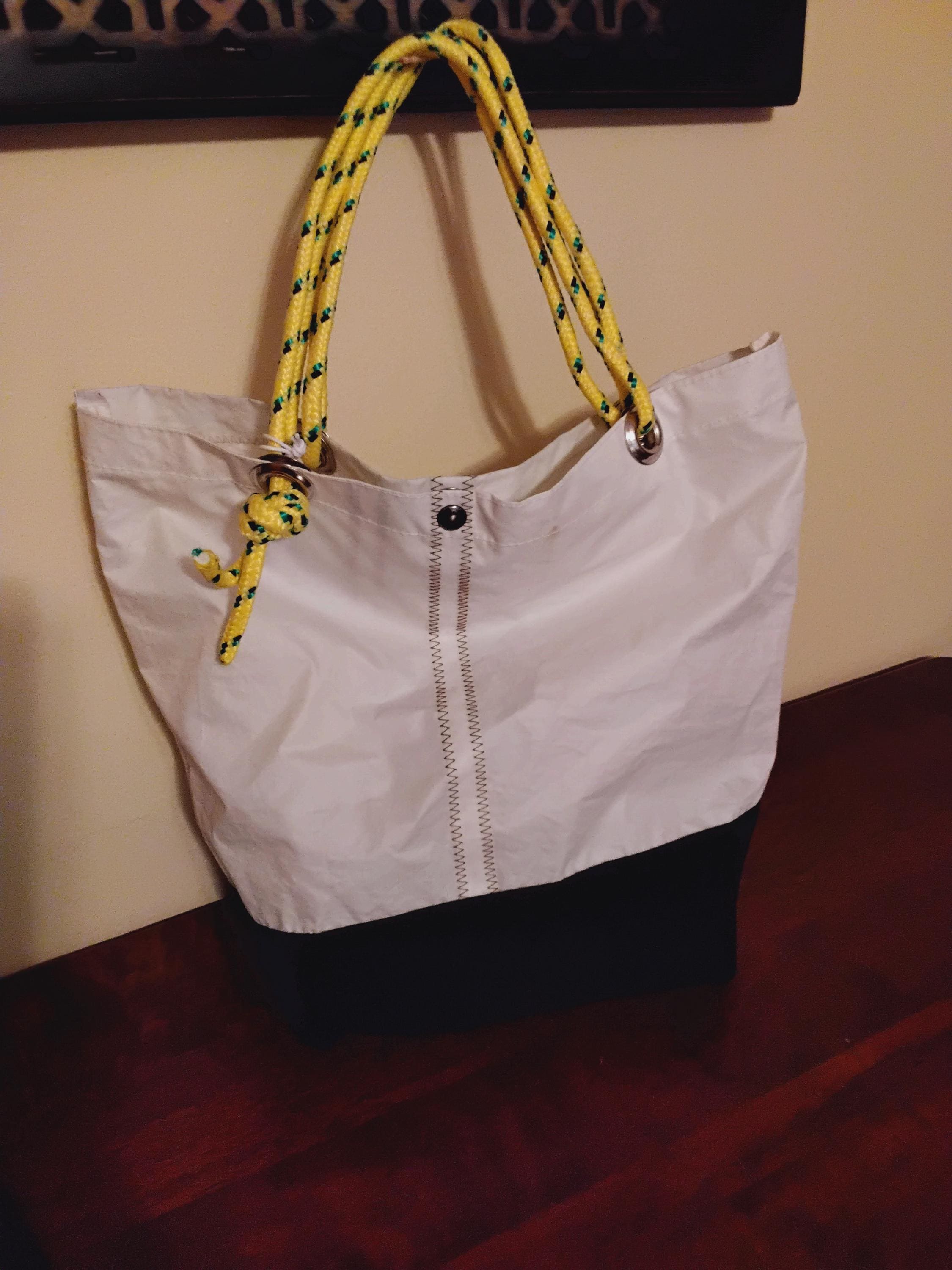 This handmade bag is one of a kind. Made from repourposed sail material along with Sunbrella makes this a great everyday bag.