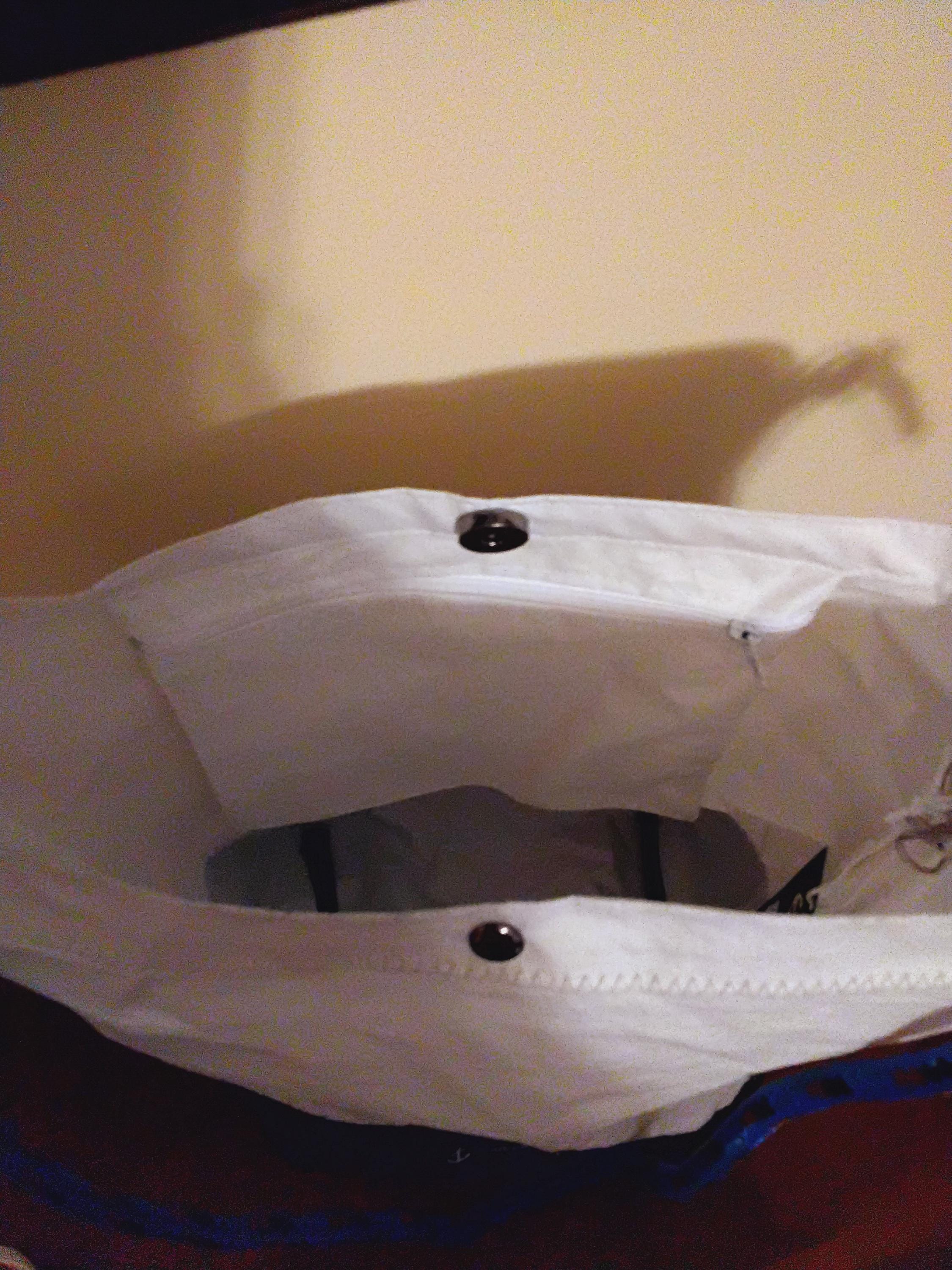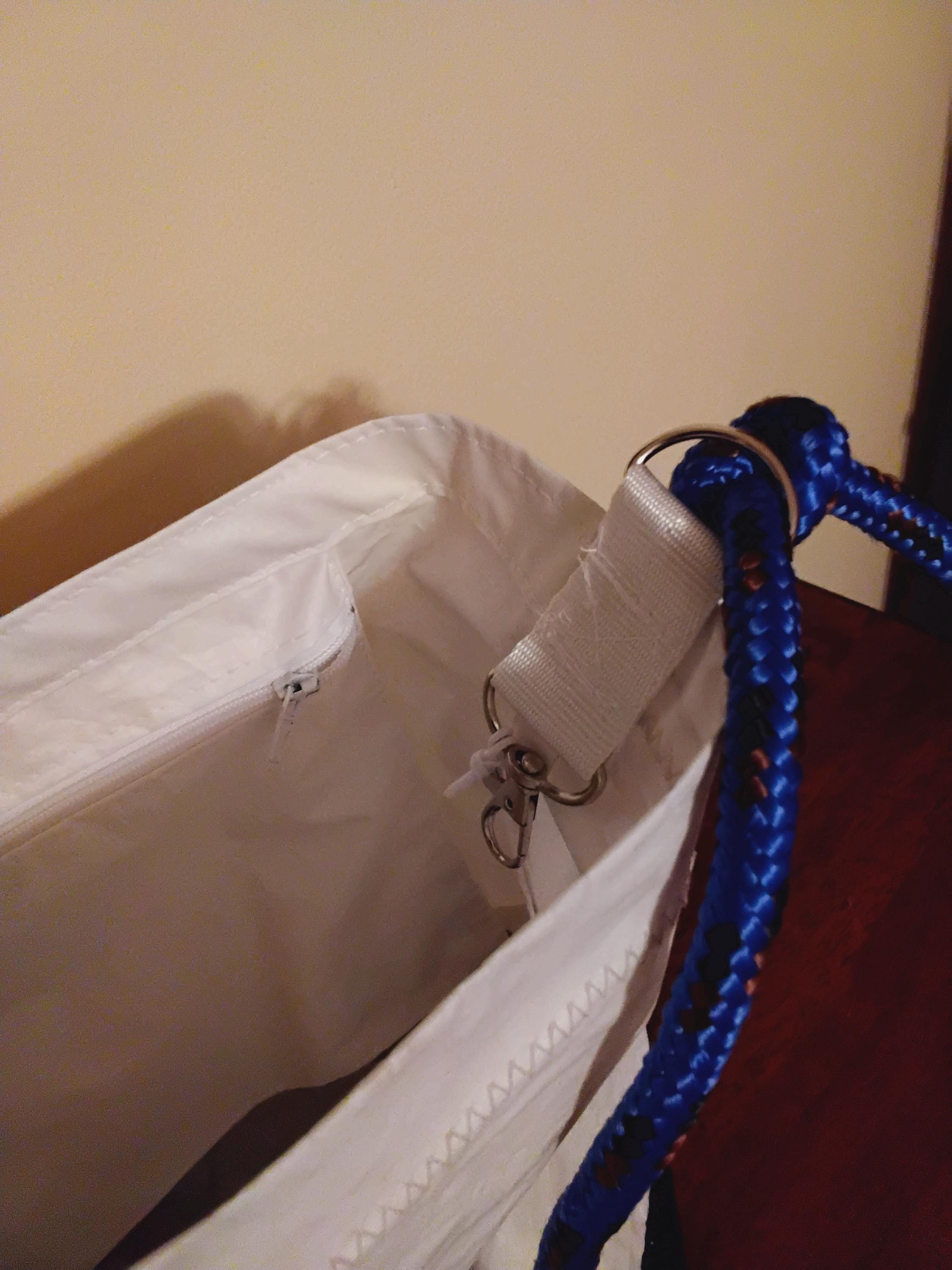This one of a kind sail bag, is handmade from a sail the once adorned the sea. Repurposed cloth along with Sunbrella fabric make up this lightweight bag.