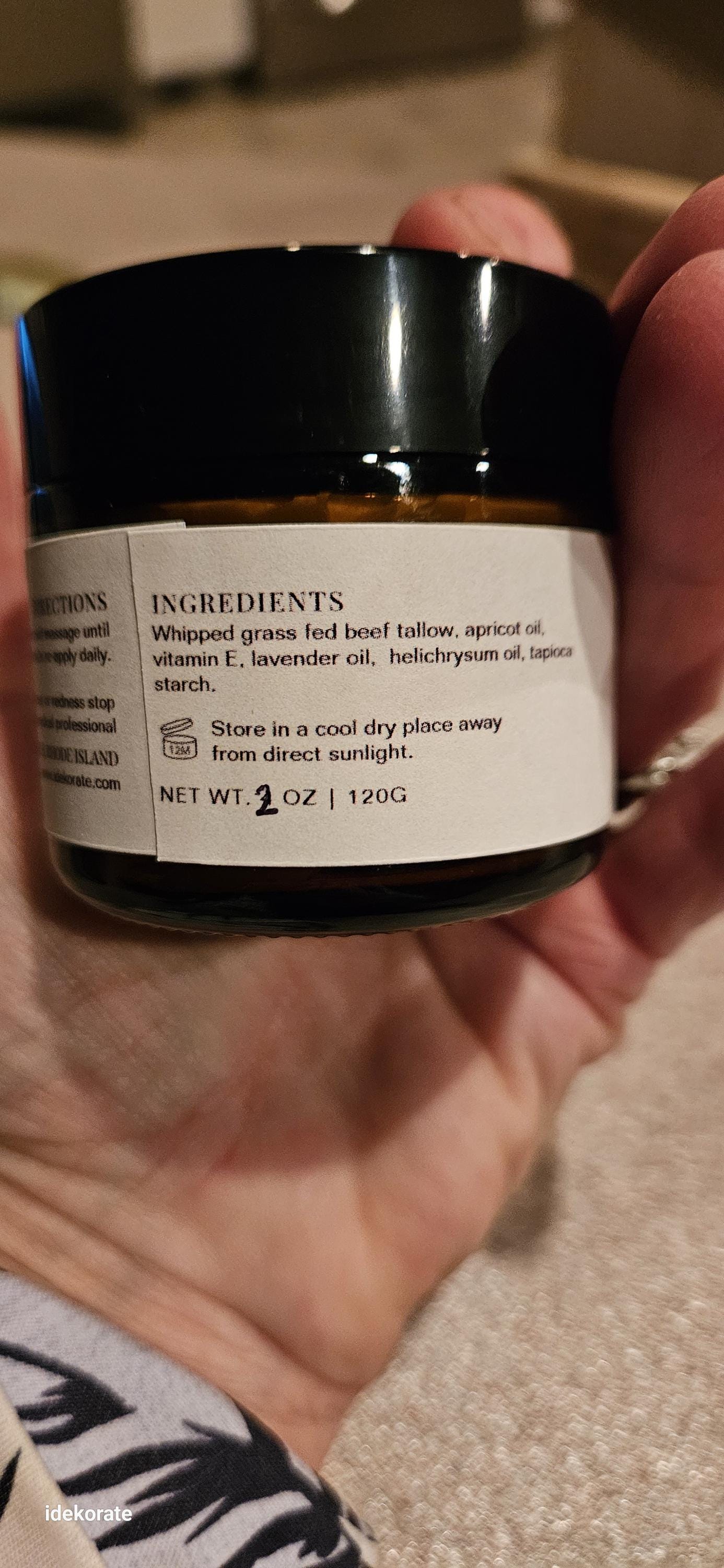 Local Grass-fed tallow, apricot kernel oil (light weight and non greasy) vitamin E oil (improves shelf life), helichrysum oil (anti-inflammatory, anti-microbial, reduce acne and diminish scars), lavender essential oil (calming scent), tapioca starch