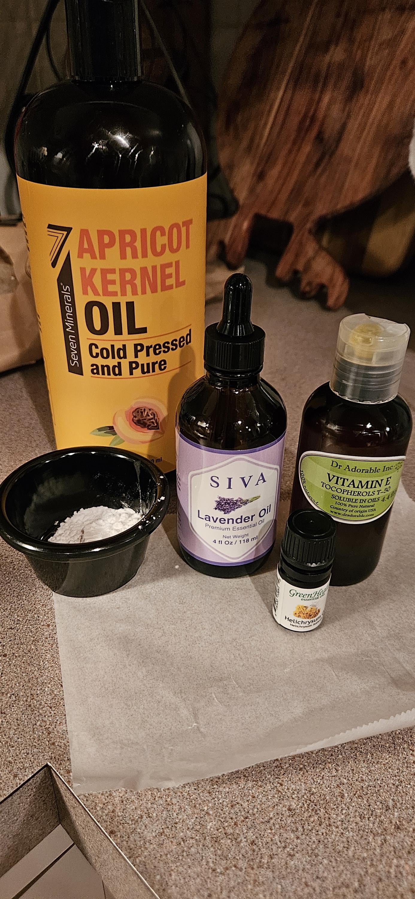 Contains: Grass Fed Tallow, Apricot Kernel Oil, Vitamin-E oil, Lavender Essential Oil, Helichrysum Essential Oil, Tapioca starch
